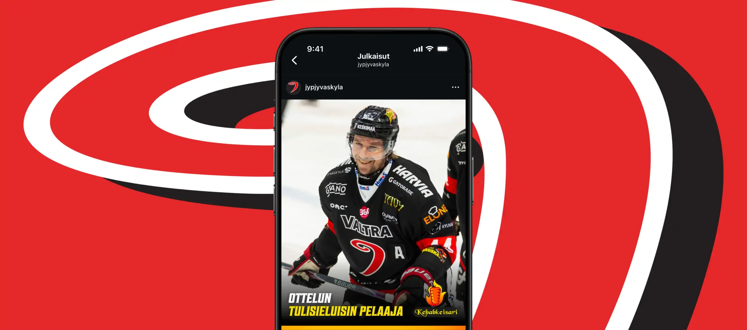 Julkaisu toteutetaan JYPin kanavissa ottelun jälkeen, ja se sisältää yrityksesi teemaan rakennetun grafiikan sekä tilannekuvan pelaajasta tai tilanteesta. Julkaisut ovat helposti mieleen jääviä, joissa myös yrityksesi jää mieleen mukaan.